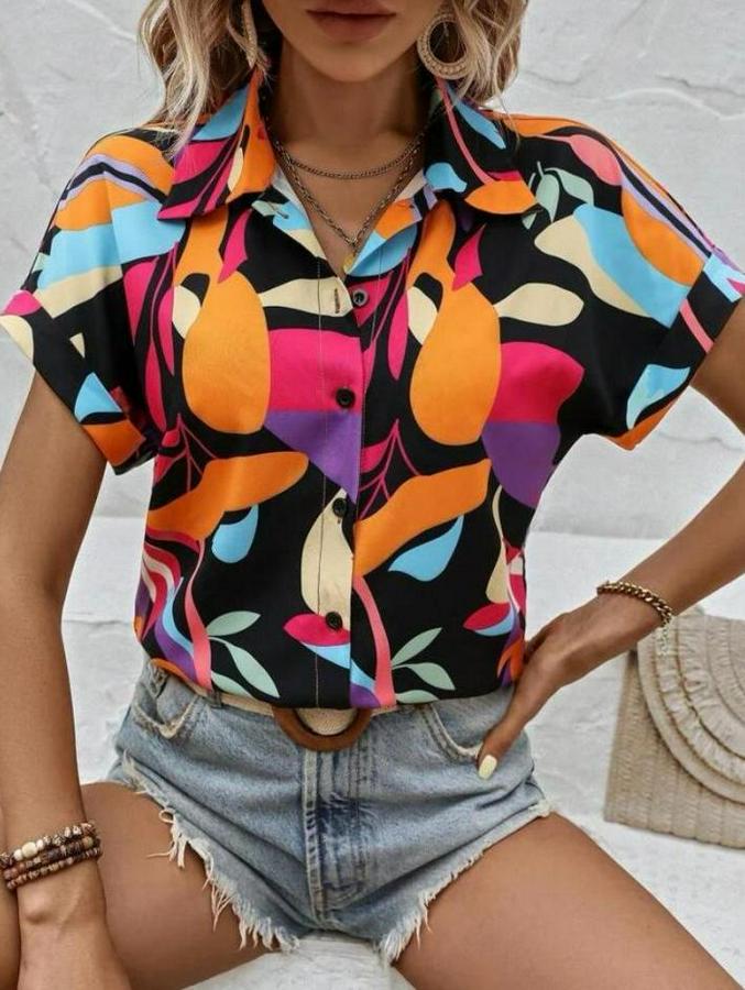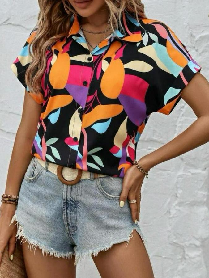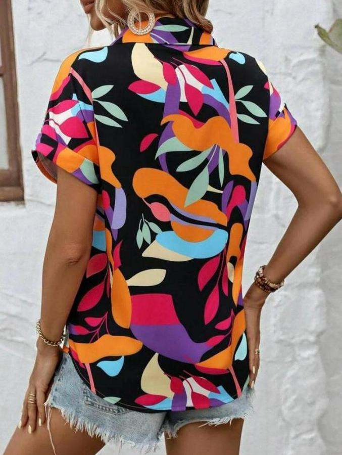 Kadın Moss Krep Kumaş Kısa Kol Çiçek Desenli Gömlek