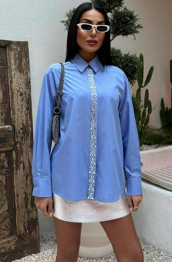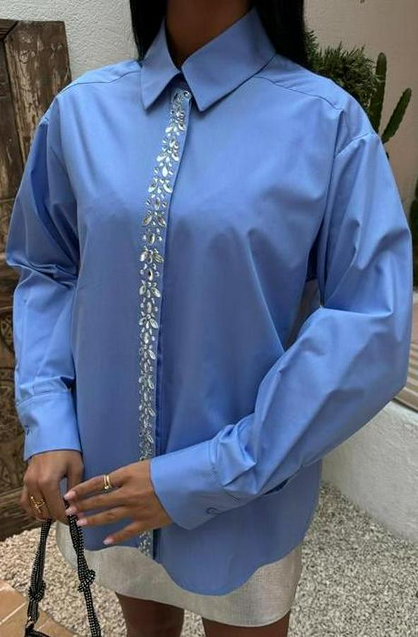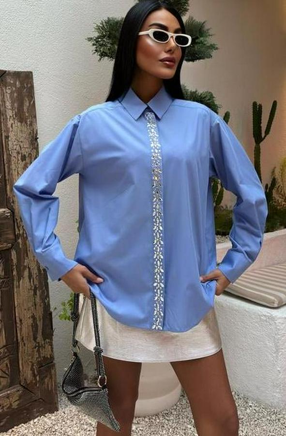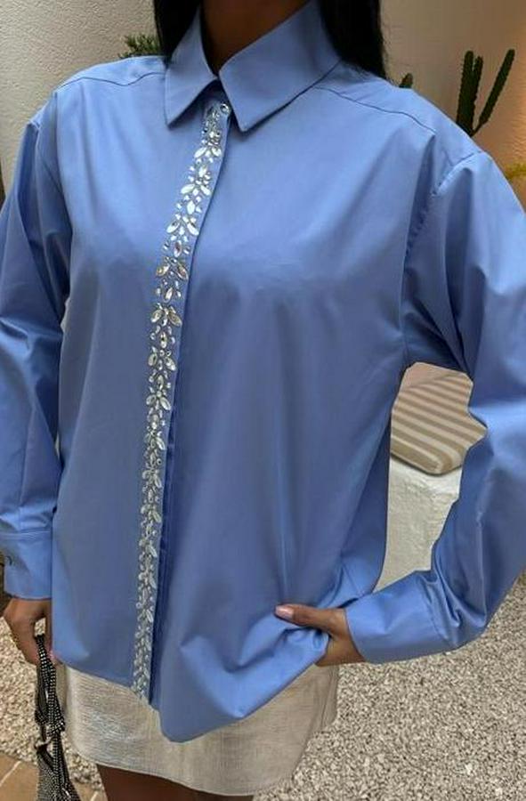 AnasayfaTüm ÜrünlerÜst GiyimGömlekÖnü Şerit Taşlı Gömlek 3448