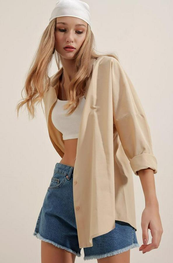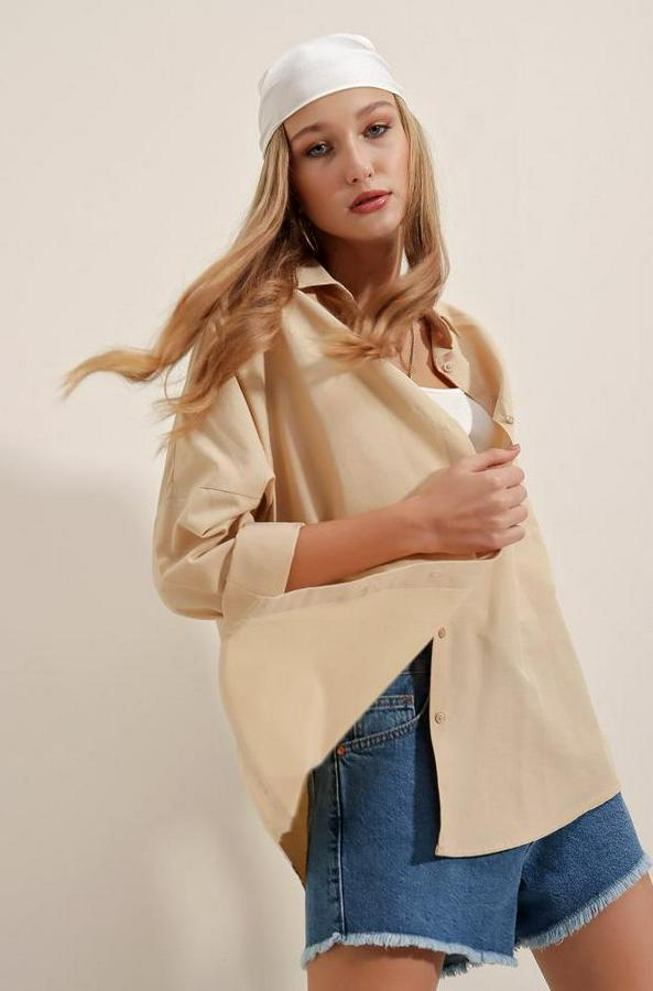 3900 Oversize Uzun Basic Gömlek - Bej