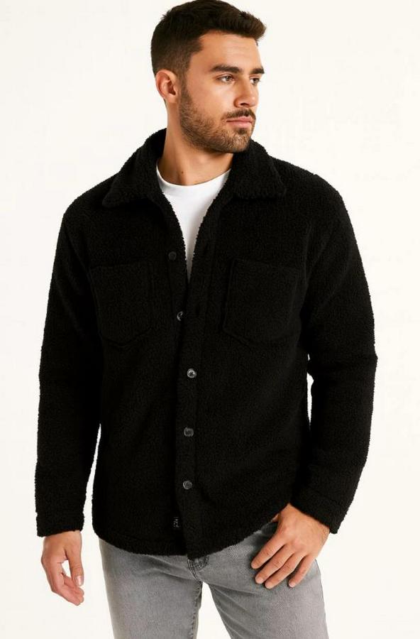 Erkek Pelüş Polar Hırka Gömlek – Yakalı, İlik Düğmeli, Göğüs Cepli, Yumuşak Dokulu Kışlık Regular Fit Rahat Günlük Model - Siyah