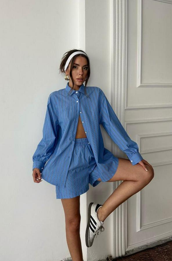 POPLİN ÇİZGİLİ GÖMLEK - ŞORT TAKIM - Mavi