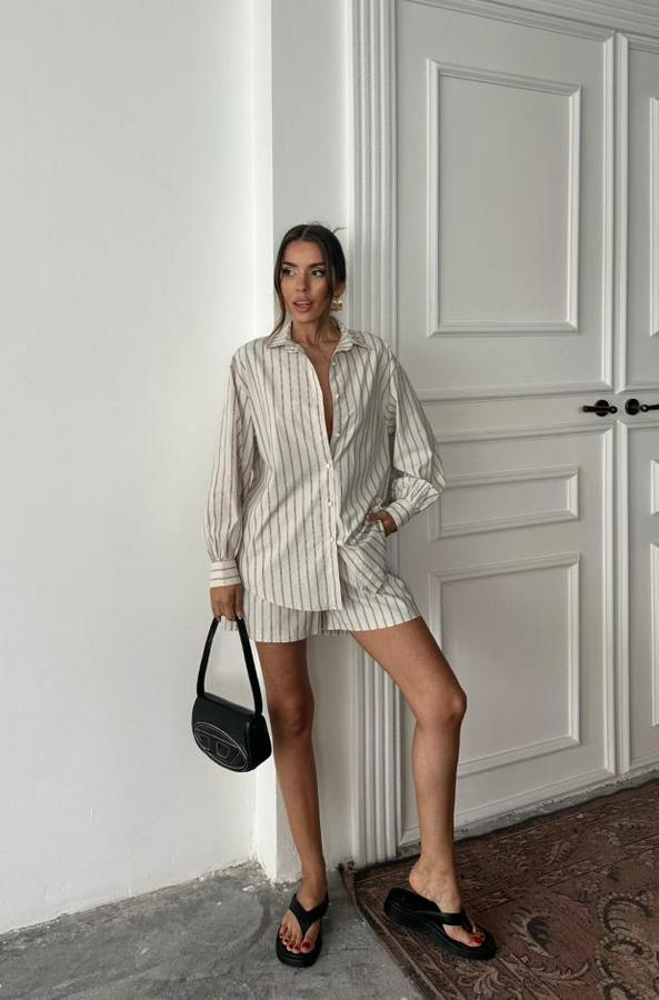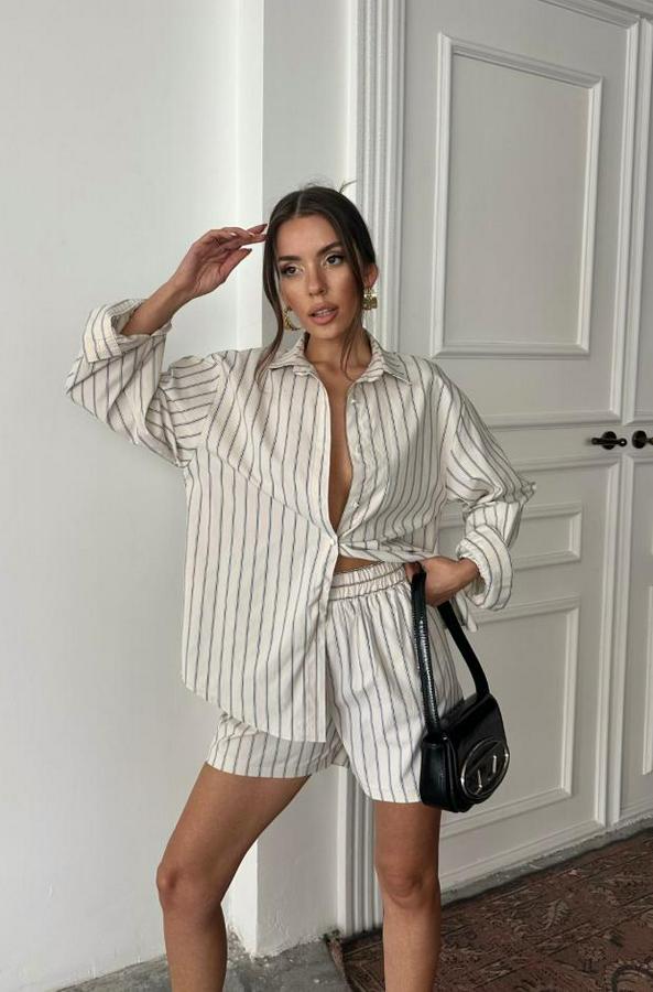 POPLİN ÇİZGİLİ GÖMLEK - ŞORT TAKIM - Bej