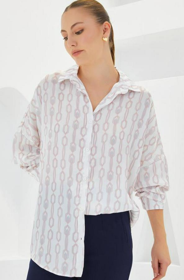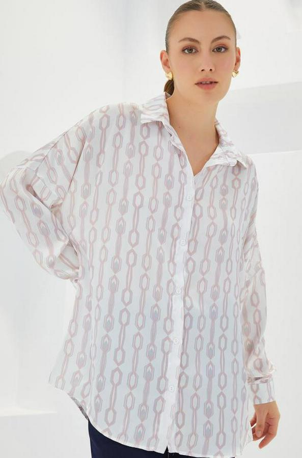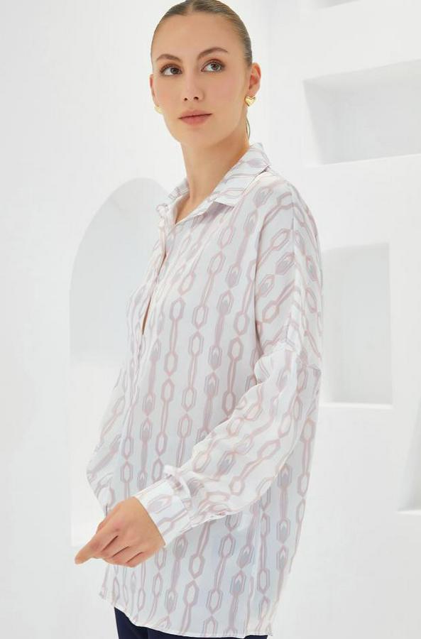 Pudra Beyaz Desenli Oversize Saten Gömlek 3985