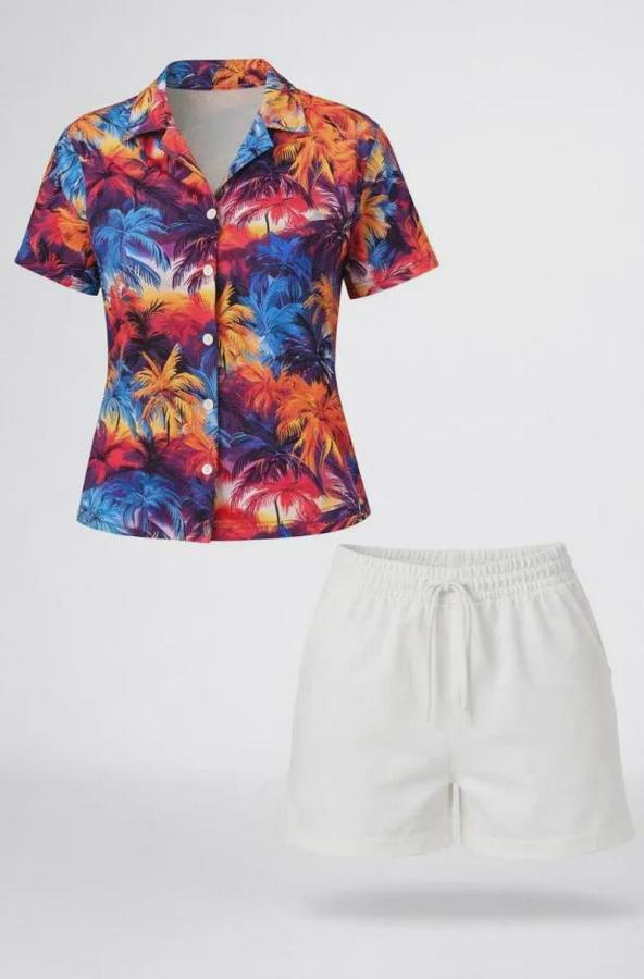 AnasayfaTüm ÜrünlerÜst GiyimGömlekRenkli Tropikal Palmiye Desenli Kısa Kol Gömlek Şort Takım Yazlık Rahat Kalıp