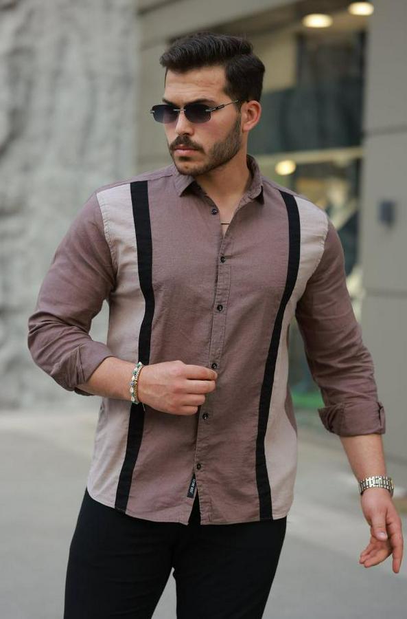 Erkek şerit Detaylı Uzun Kollu Pamuklu Keten Gömlek