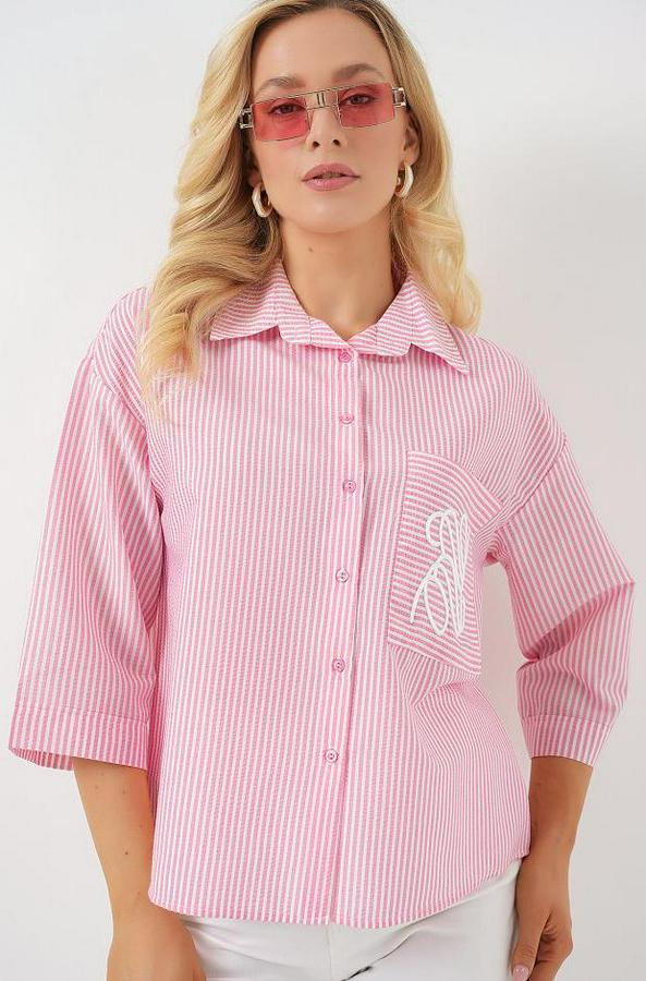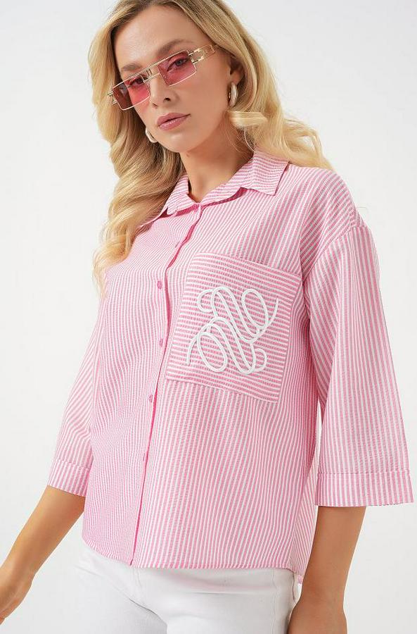 Tek Cep Nakışlı Gömlek 20328 - Pembe