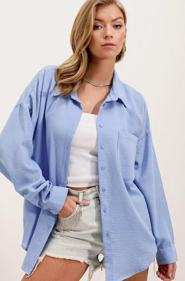 20153 Tek Cepli Oversize Keten Gömlek - Mavi