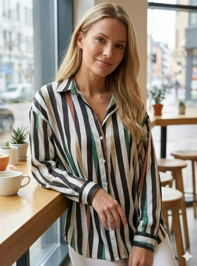 Kadın Uzun Kollu Dalgalı Desen Baskılı Gömlek