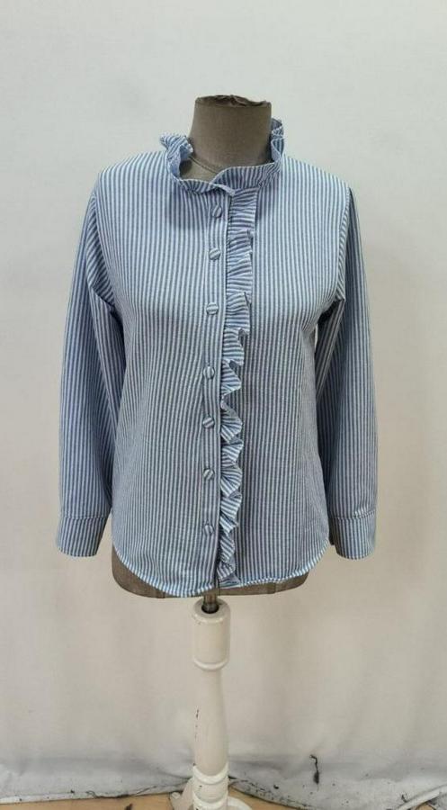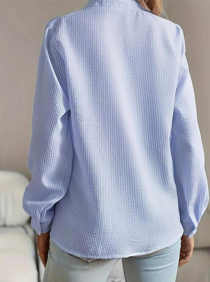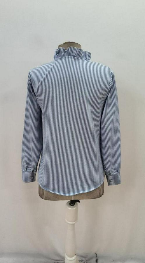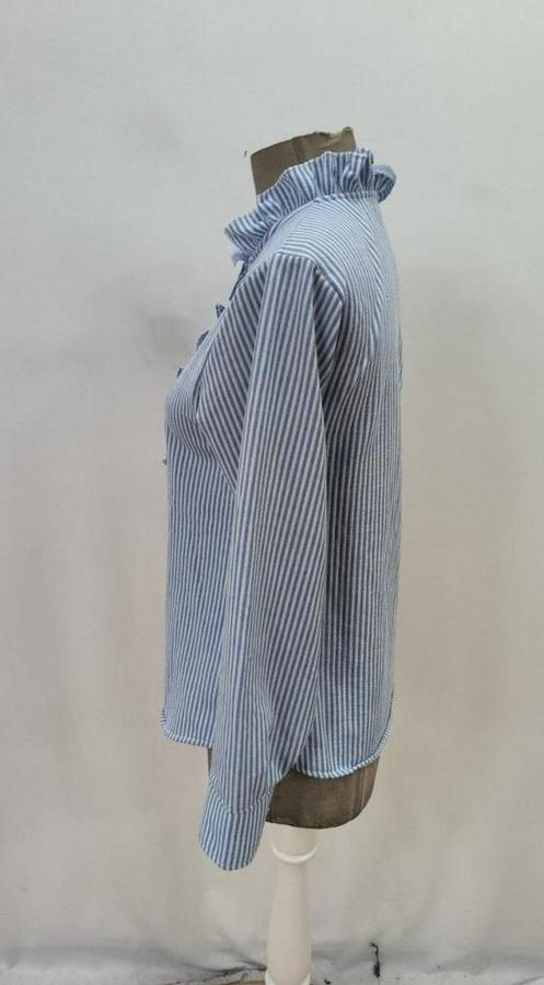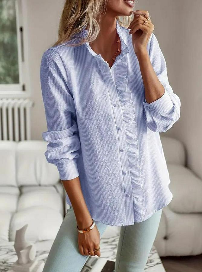 AnasayfaTüm ÜrünlerÜst GiyimGömlekUzun Kollu Fırfır Yakalı Önden Düğmeli Çizgili Burgu Gömlek