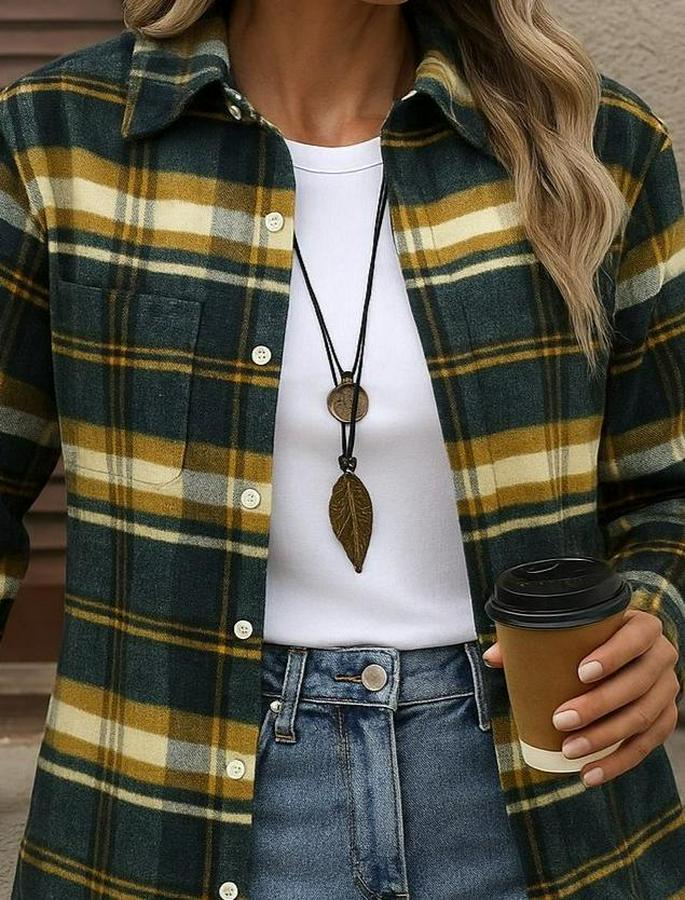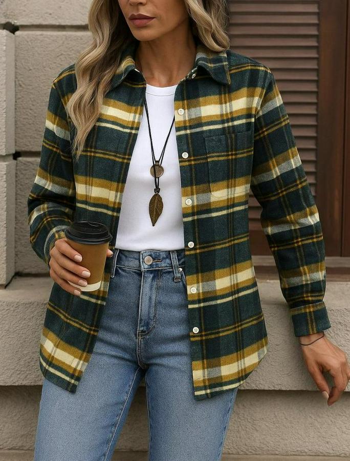 Kadın Uzun Kollu Kare Desenli önden Düğmeli Dokuma Gömlek