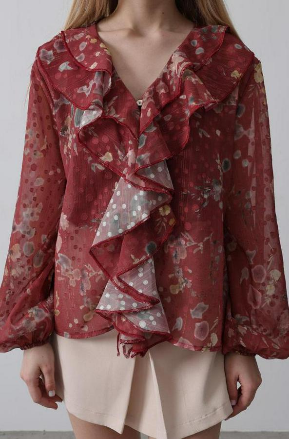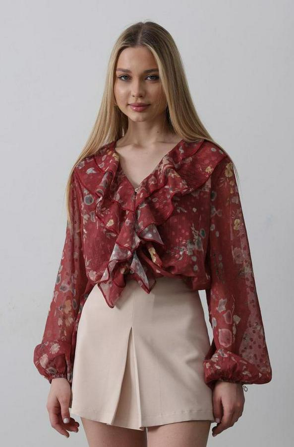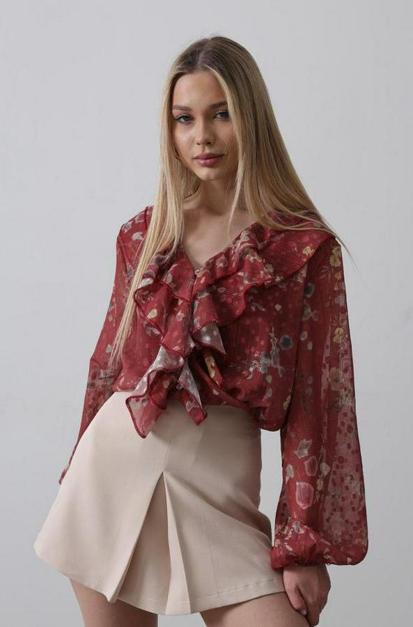 AnasayfaTüm ÜrünlerÜst GiyimGömlekVolanlı Çiçek Desen Şifon Gömlek