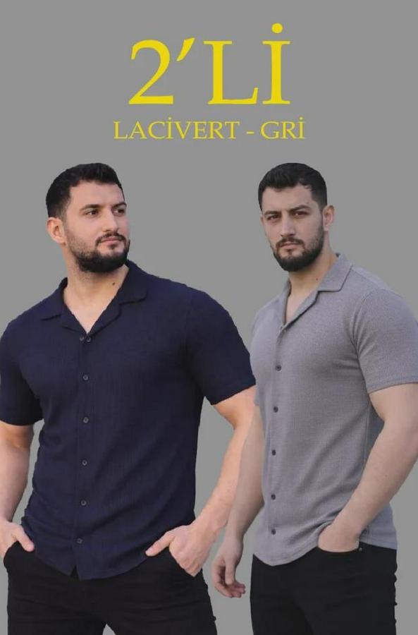 Erkek Waffle Dokuma Açık Yakalı Düğmeli Regular Kalıp 2’li Gömlek Seti - Lacivert - Gri