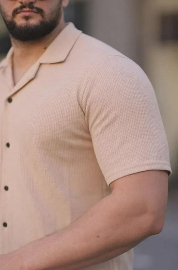 Erkek Waffle Kumaş Kısa Kollu Düğmeli Açık Yaka Regular Fit Gömlek - Bej