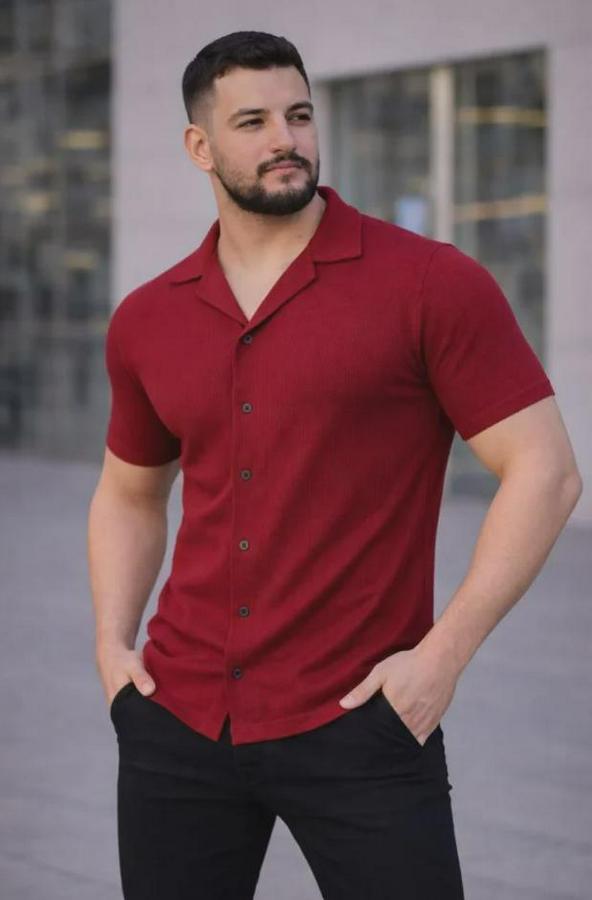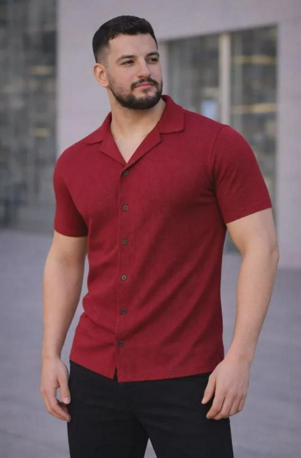 Erkek Waffle Kumaş Kısa Kollu Düğmeli Açık Yaka Regular Fit Gömlek - Kırmızı