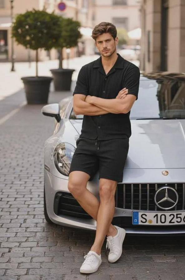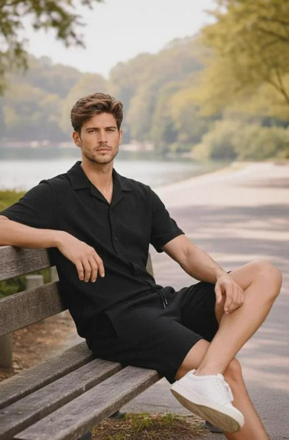 Erkek Waffle Kumaş Kısa Kollu Gömlek Şort Takım Regular Fit Yazlık İkili Set - Siyah
