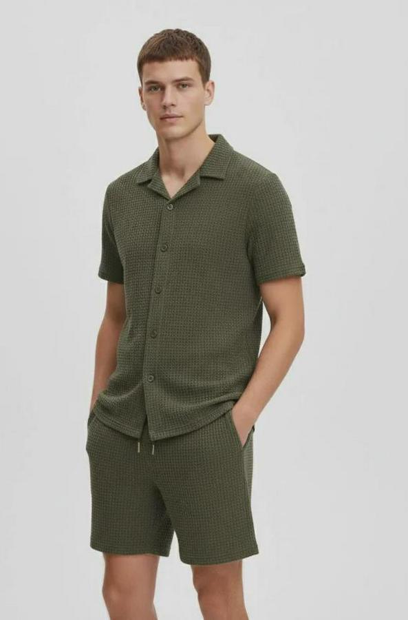 Erkek Waffle Kumaş Kısa Kollu Gömlek Şort Takım Regular Fit Yazlık İkili Set - Haki