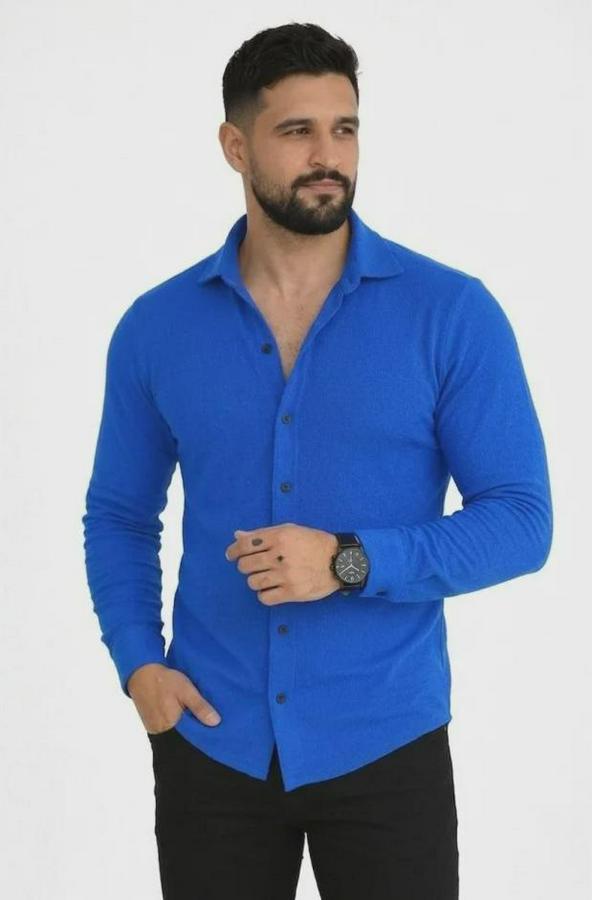 Erkek Waffle Kumaş Uzun Kollu Düğmeli Açık Yaka Regular Fit Gömlek - Saks Mavisi