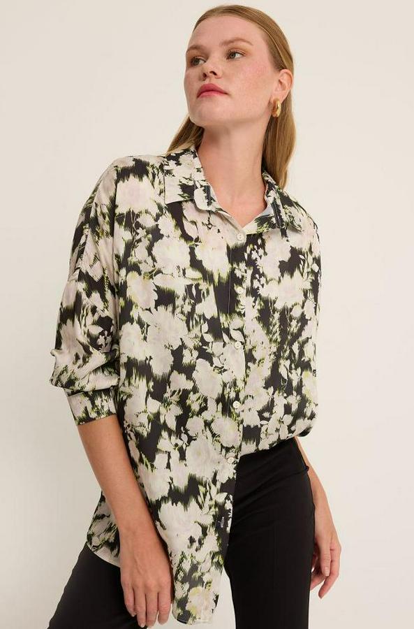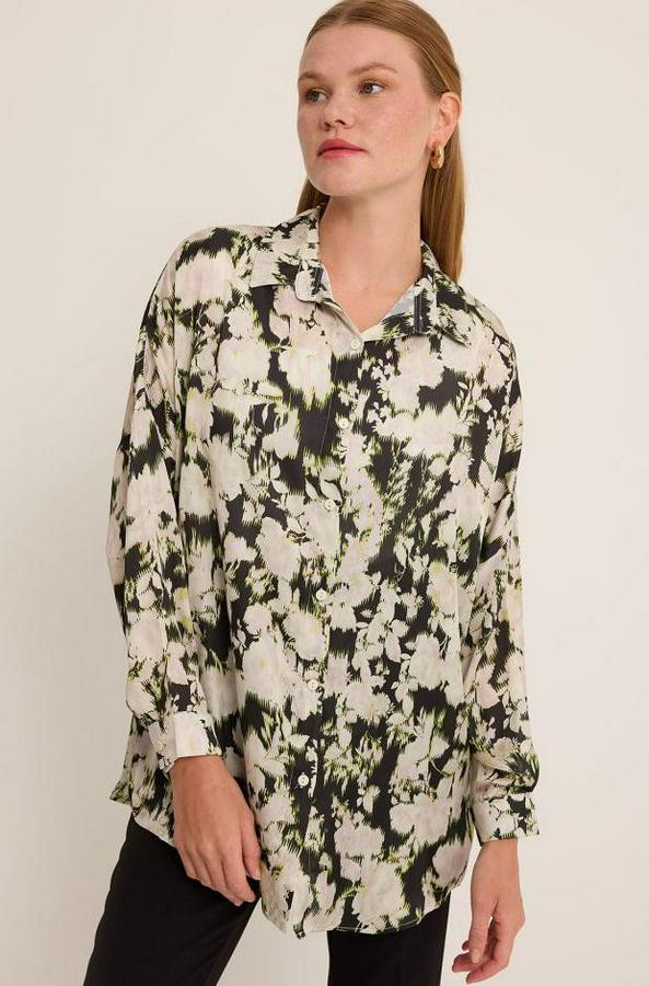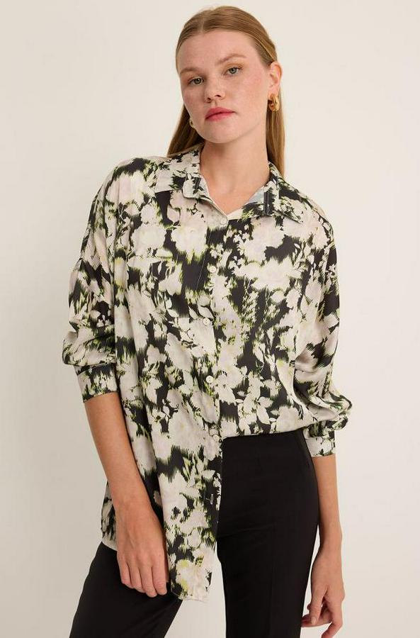AnasayfaTüm ÜrünlerÜst GiyimGömlekYeşil Siyah Çiçek Desenli Oversize Saten Gömlek 3985