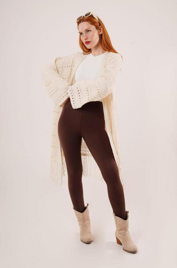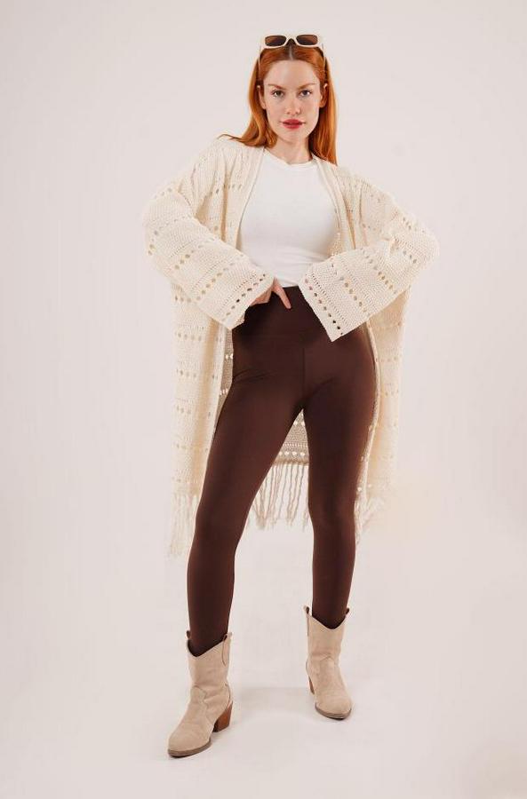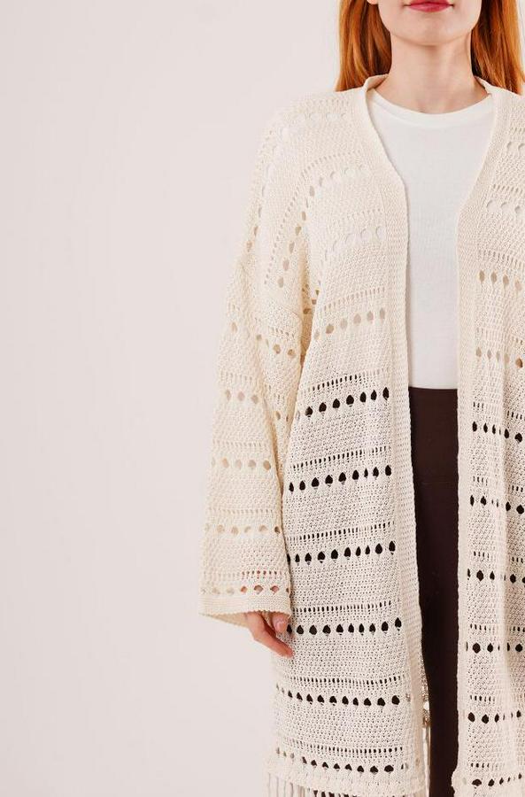 Delikli Geçişli Püskül Detay Uzun Triko Krem Hırka