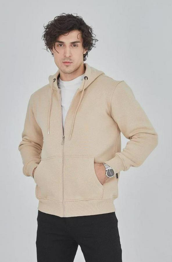 Erkek Kapüşonlu Düz Fermuarlı Hırka - Bej