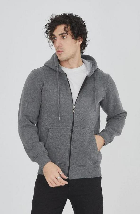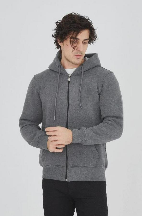 Erkek Kapüşonlu Düz Fermuarlı Hırka - Füme
