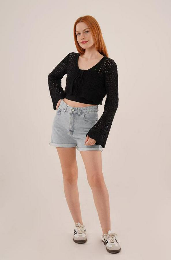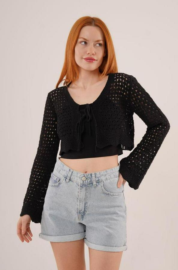 Ön Bağlamalı Ajurlu Crop Siyah Hırka