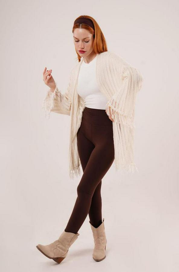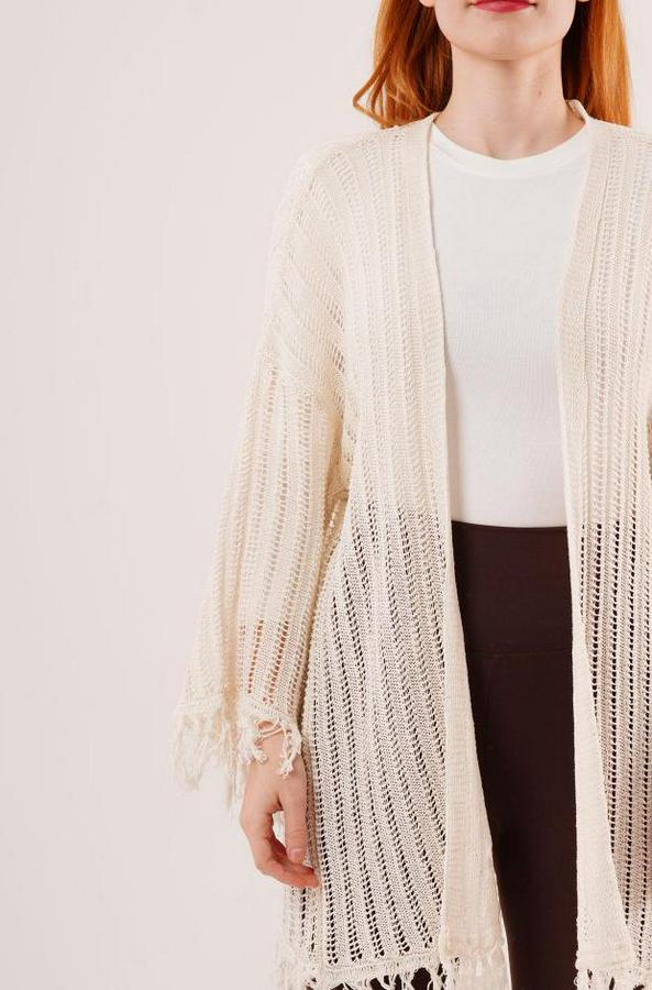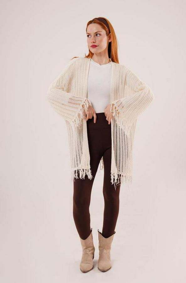 Püskül Detaylı Delikli Model Krem Hırka