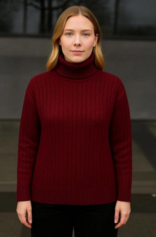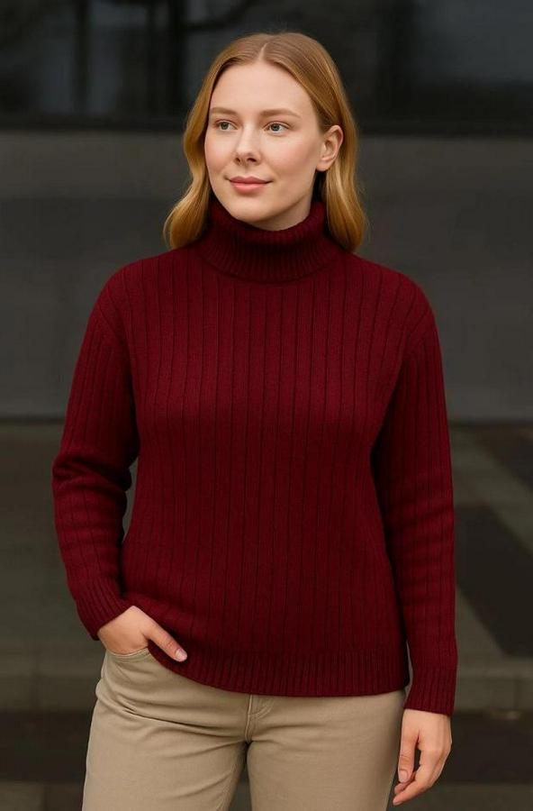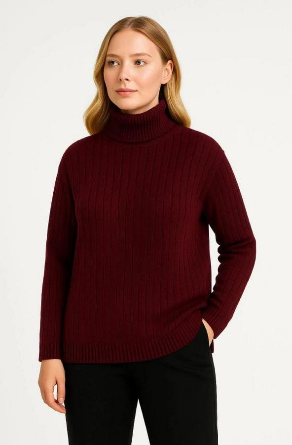 Balıkcı Yaka Bağazlı Triko Kazak Pamuklu Kalın Fitilli Dokuma - Bordo
