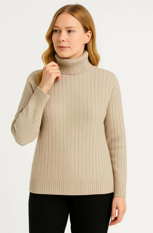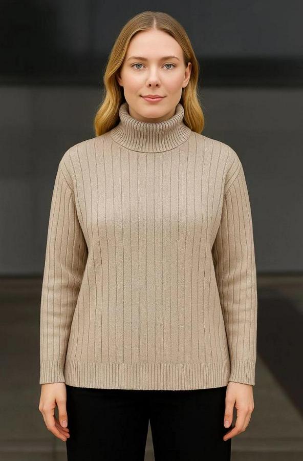 Balıkcı Yaka Bağazlı Triko Kazak Pamuklu Kalın Fitilli Dokuma - Bej