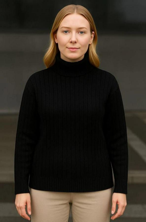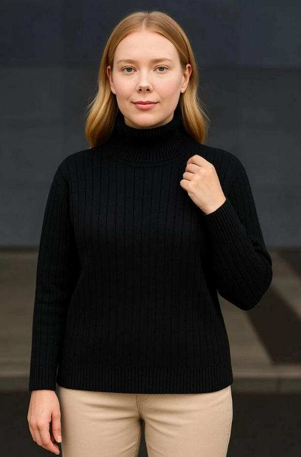 Balıkcı Yaka Bağazlı Triko Kazak Pamuklu Kalın Fitilli Dokuma - Siyah