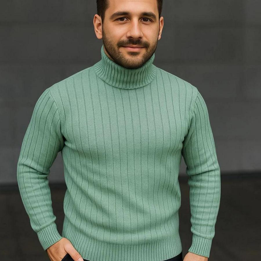 Erkek Balıkcı Yaka Bağazlı Triko Kazak Pamuklu Kalın Fitilli Dokuma, Regular Fit Uzun Kollu Kışlık Model - Mint Yeşili
