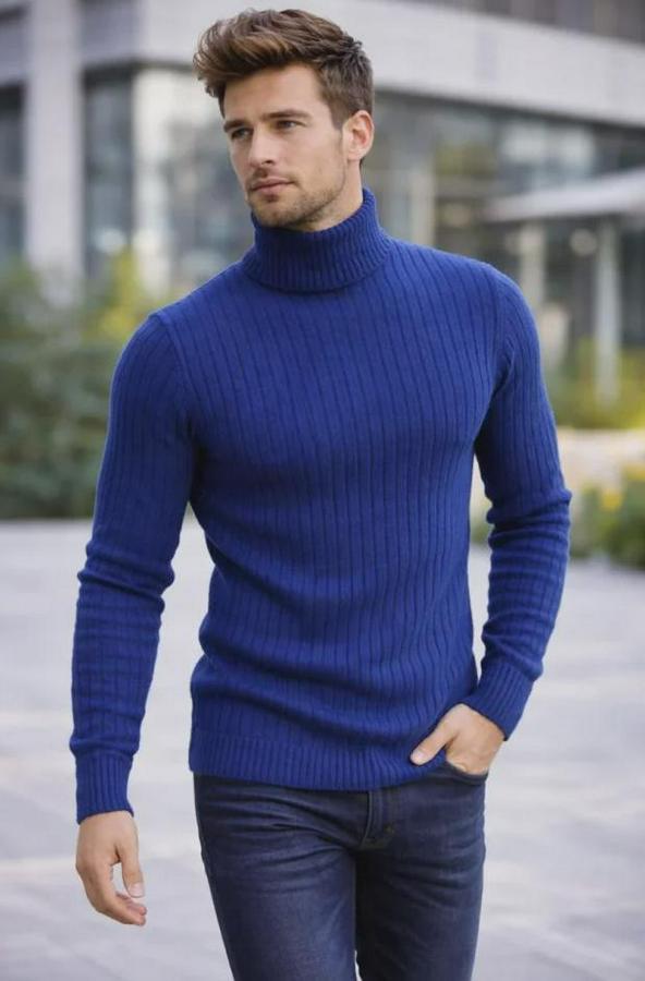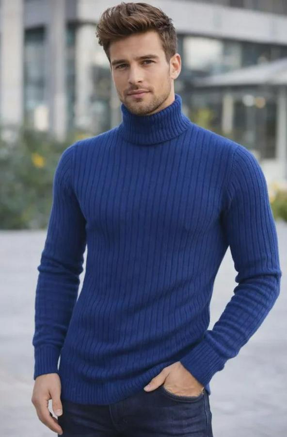 Balıkcı Yaka Bağazlı Triko Kazak Pamuklu Kalın Fitilli Dokuma, Regular Fit Uzun Kollu Kışlık Model