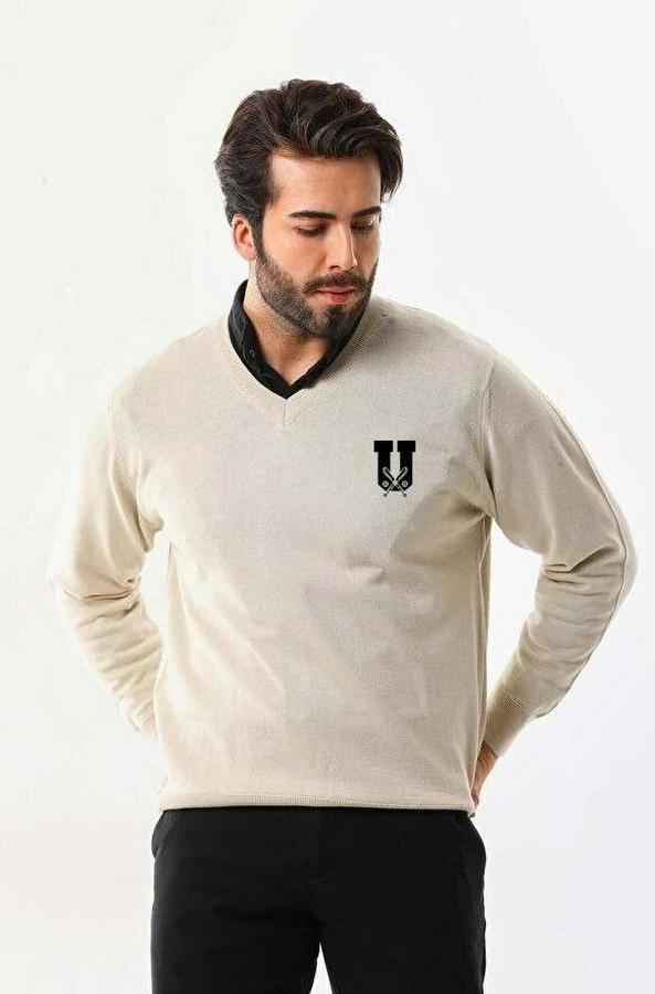 Baskılı V Yaka Uzun Kol Dokuma Triko - Bej