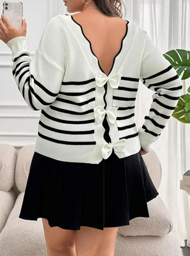 Kadın Beyaz Sırt Bağlama Detaylı çizgi Desen Triko Bluz