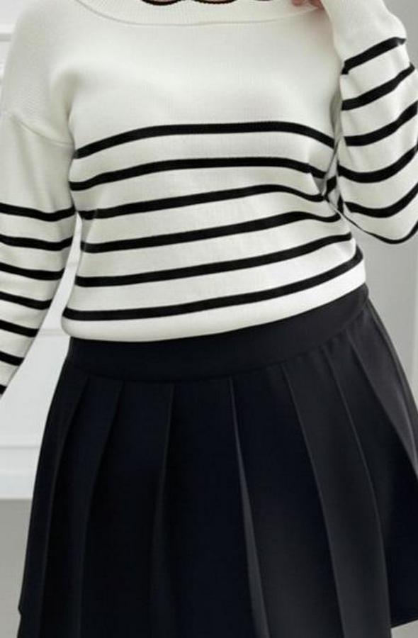 AnasayfaTüm ÜrünlerÜst GiyimKazak & HırkaKazakBeyaz Sırt Bağlama Detaylı Çizgi Desen Triko Bluz