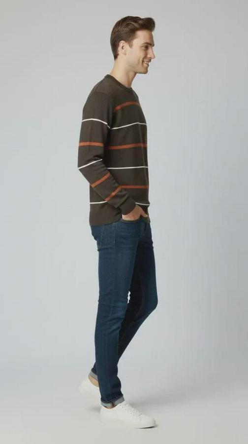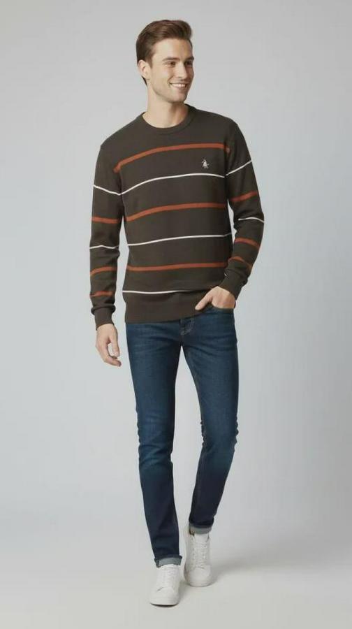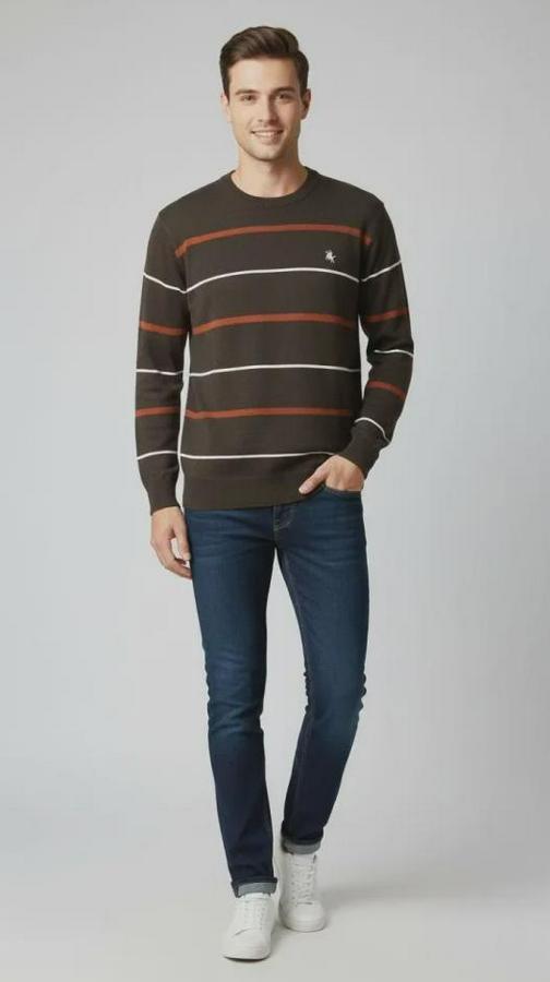 Erkek Bisiklet Yaka Cizgili Triko Kazak Yumuşak Dokulu Pamuklu Ince Dokuma, Uzun Kollu Rahat Regular Kalıp - Koyu Kahverengi