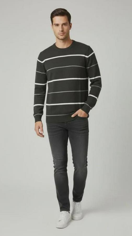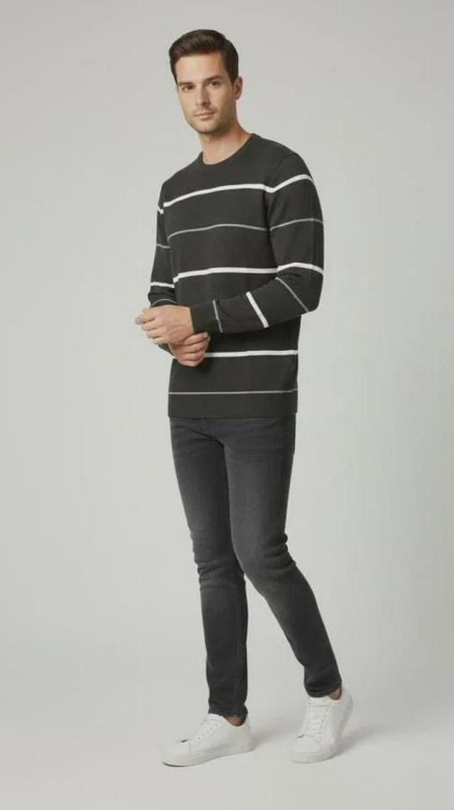 Erkek Bisiklet Yaka Cizgili Triko Kazak Yumuşak Dokulu Pamuklu Ince Dokuma, Uzun Kollu Rahat Regular Kalıp - Füme