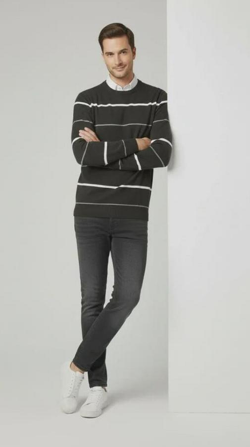 Bisiklet Yaka Cizgili Triko Kazak Yumuşak Dokulu Pamuklu Ince Dokuma, Uzun Kollu Rahat Regular Kalıp
