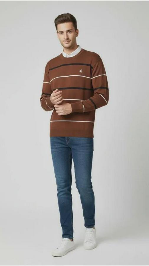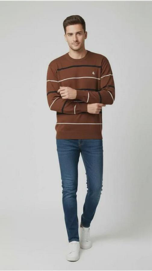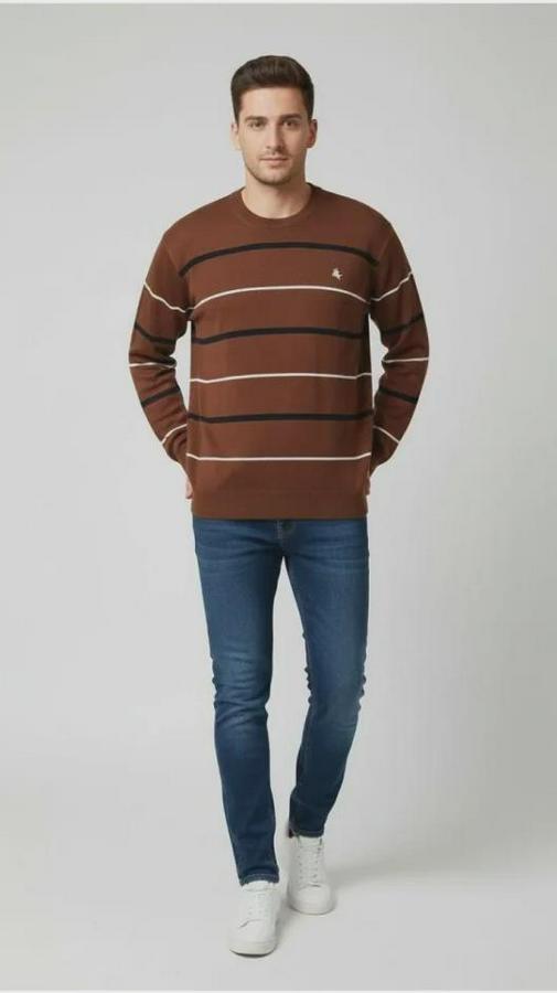 Erkek Bisiklet Yaka Cizgili Triko Kazak Yumuşak Dokulu Pamuklu Ince Dokuma, Uzun Kollu Rahat Regular Kalıp - Kahverengi