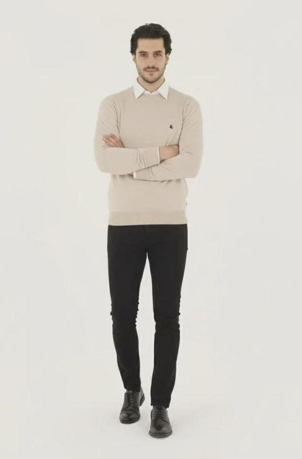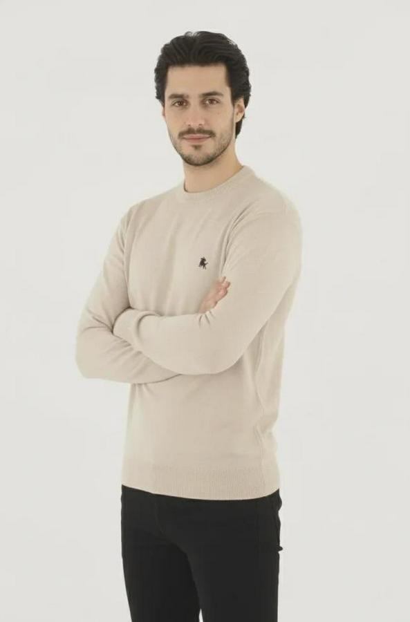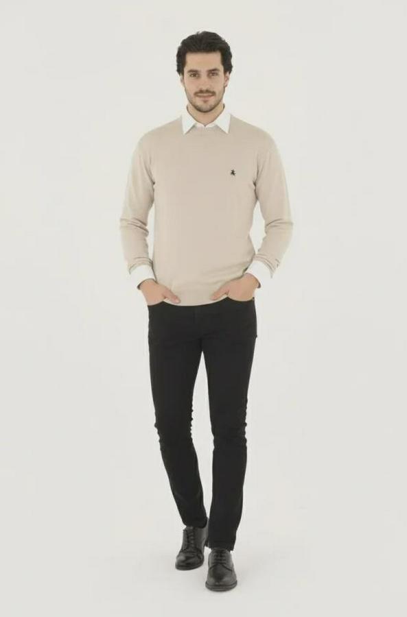Erkek Bisiklet Yaka Nakış Işlemeli Triko Kazak Yumuşak Dokulu Pamuklu Ince Dokuma, Uzun Kollu Rahat Regular Kalıp - Bej