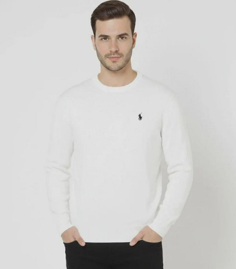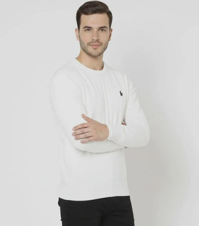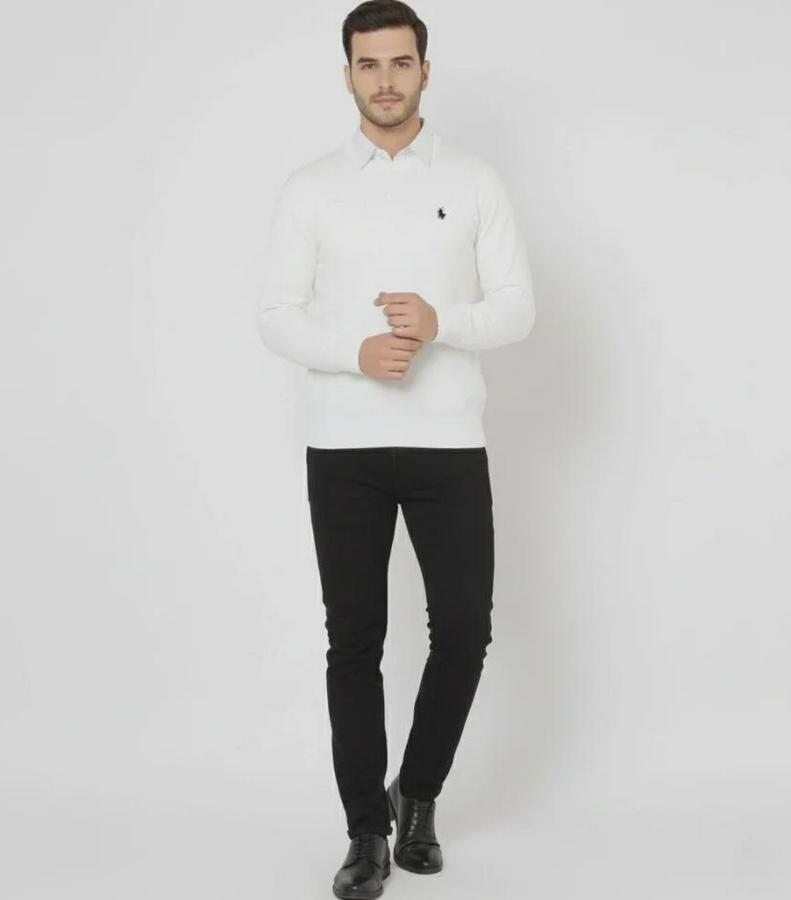 Erkek Bisiklet Yaka Nakış Işlemeli Triko Kazak Yumuşak Dokulu Pamuklu Ince Dokuma, Uzun Kollu Rahat Regular Kalıp - Beyaz