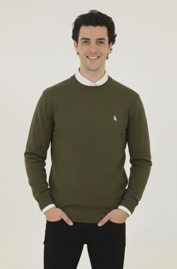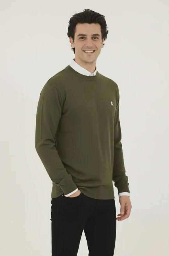 Erkek Bisiklet Yaka Nakış Işlemeli Triko Kazak Yumuşak Dokulu Pamuklu Ince Dokuma, Uzun Kollu Rahat Regular Kalıp - Haki