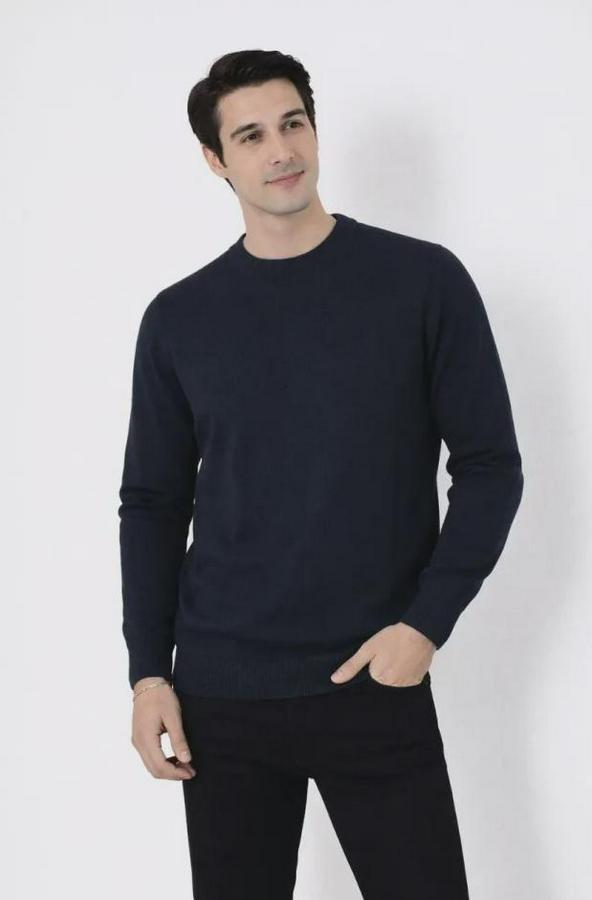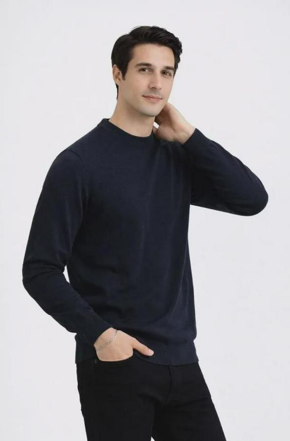 Erkek Bisiklet Yaka Triko Kazak Yumuşak Dokulu Pamuklu Ince Dokuma, Uzun Kollu Rahat Regular Kalıp - Lacivert