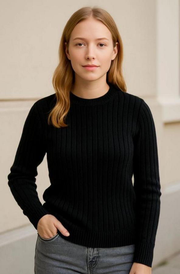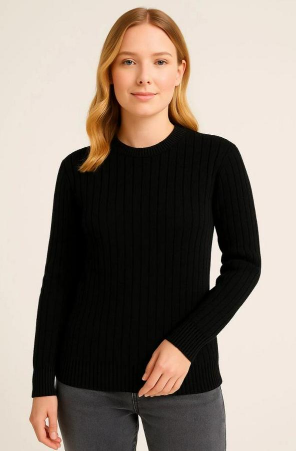 Bisiklet Yuvarlak Yaka Triko Kazak Pamuklu Kalın Fitilli Dokuma, Regular Fit Uzun Kollu Kışlık Model - Siyah