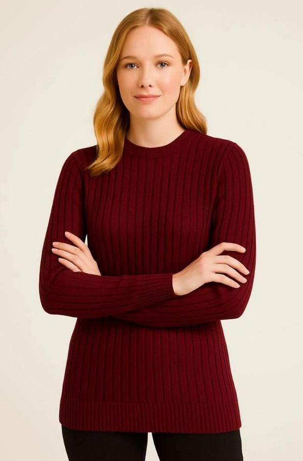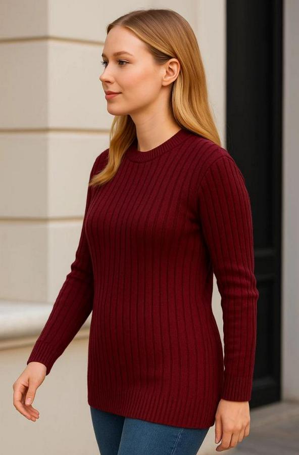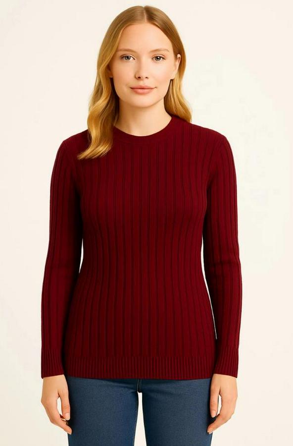 Bisiklet Yuvarlak Yaka Triko Kazak Pamuklu Kalın Fitilli Dokuma, Regular Fit Uzun Kollu Kışlık Model - Bordo