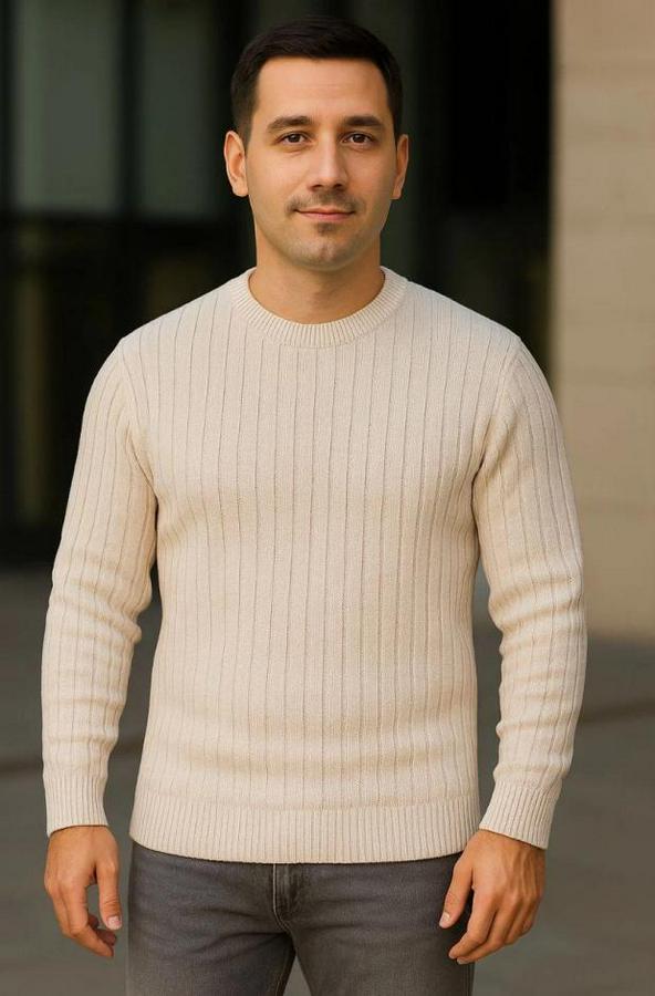Erkek Bisiklet Yuvarlak Yaka Triko Kazak Pamuklu Kalın Fitilli Dokuma, Regular Fit Uzun Kollu Kışlık Model - Bej