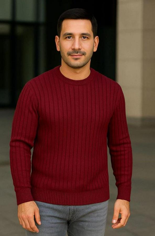 Erkek Bisiklet Yuvarlak Yaka Triko Kazak Pamuklu Kalın Fitilli Dokuma, Regular Fit Uzun Kollu Kışlık Model - Bordo