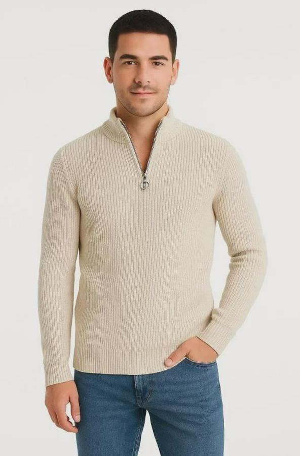 Erkek Fitilli Triko Kazak 2’li Set – Siyah - Bej Kalın Dokuma Pamuklu Regular Fit V Yaka Fermuarlı Uzun Kollu Rahat Kışlık Kazak Kombini