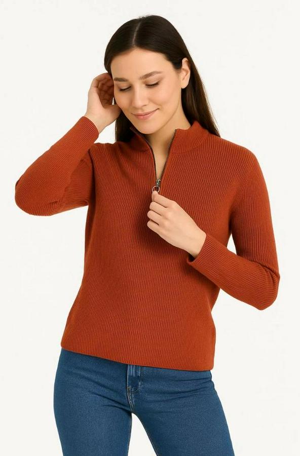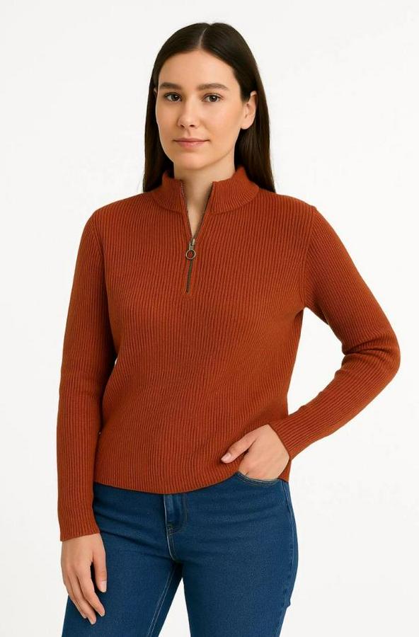 KADIN Yarım Fermuarlı Triko Kazak – Selanik Örgü, Dik Yaka, Pamuklu Dokuma, Oversize Uzun Kollu Kışlık Model - Kiremit