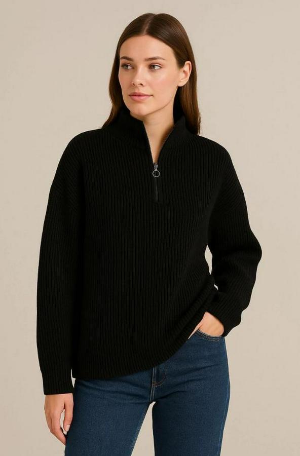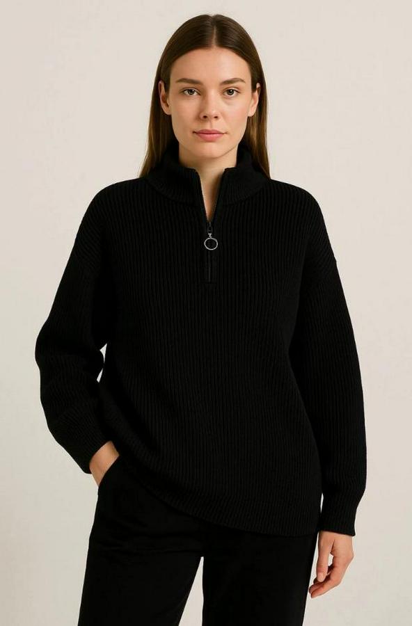 KADIN Yarım Fermuarlı Triko Kazak – Selanik Örgü, Dik Yaka, Pamuklu Dokuma, Oversize Uzun Kollu Kışlık Model - Siyah